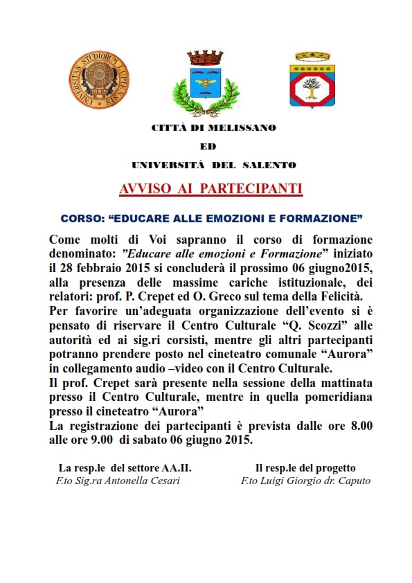 AVVISO AI PARTECIPANTI AL CONVEGNO DEL 6 GIUGNO 2015 "EDUCARE ALLE EMOZIONI E FORMAZIONE"